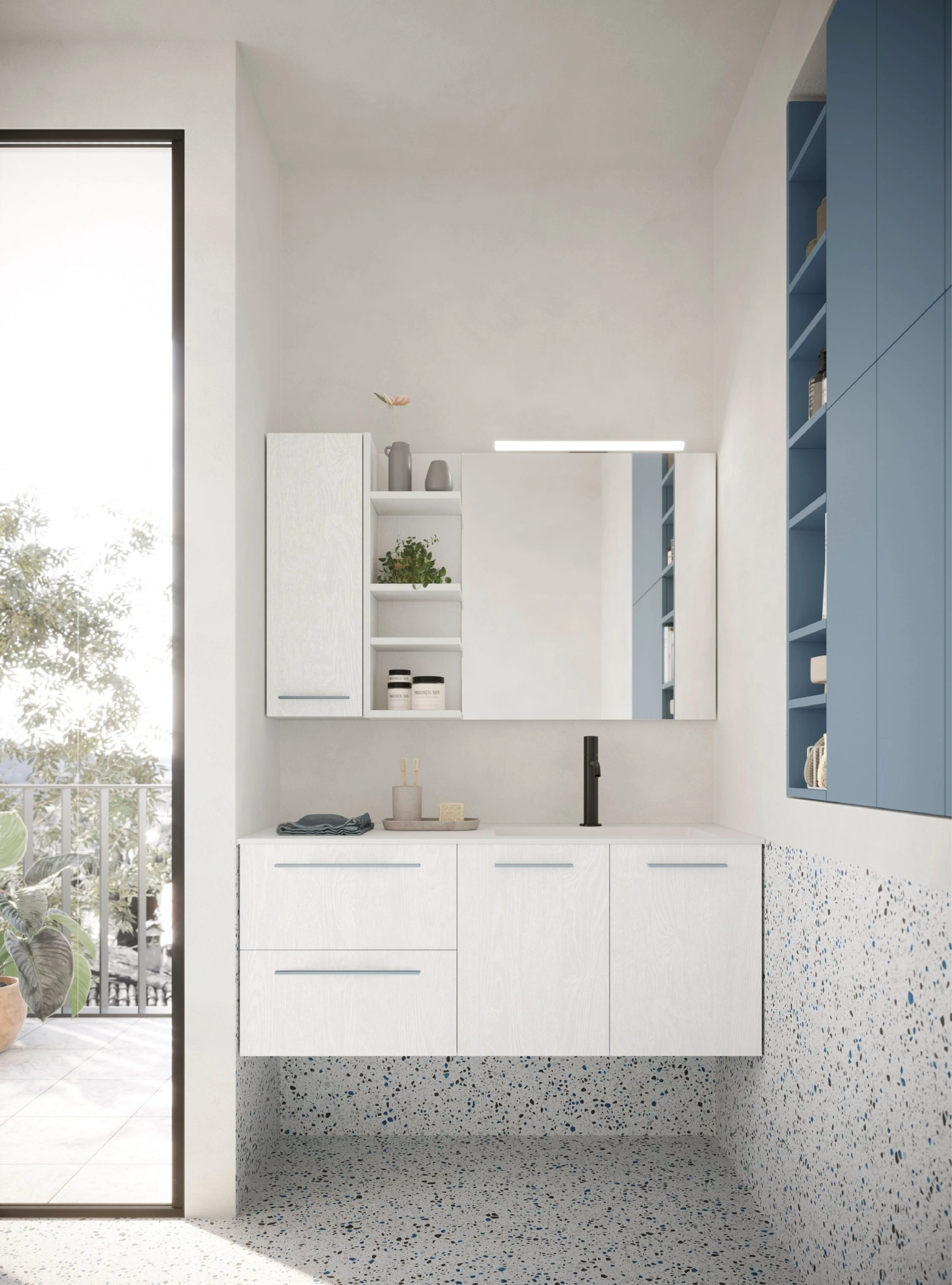 Arreda la stanza del benessere moderno al meglio con Ho-me plus liscio 53, mobili bagno sospesi e oggetti in melaminico di Arbi.