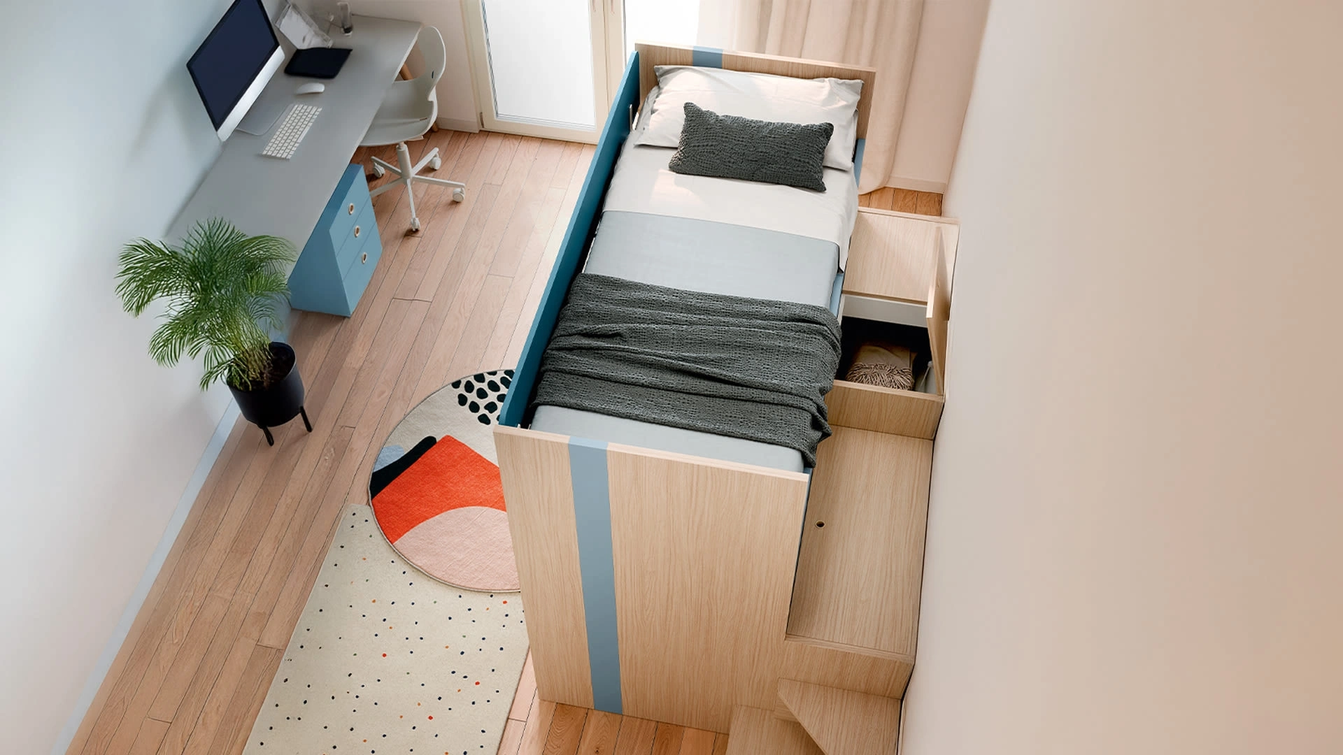 Gli elementi accessori disponibili per le Camerette con letti a castello di Nidi sono sempre personalizzabili, per evitare ogni problematicità di spazio e funzionalità.