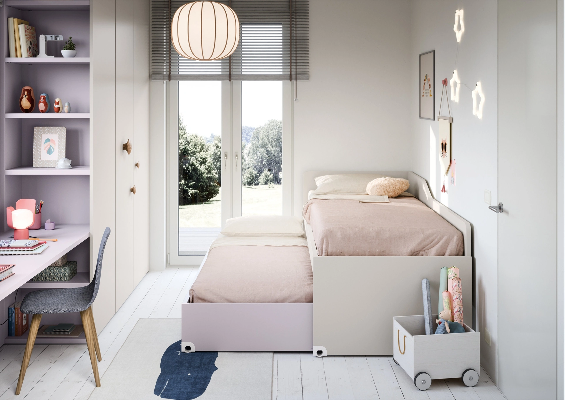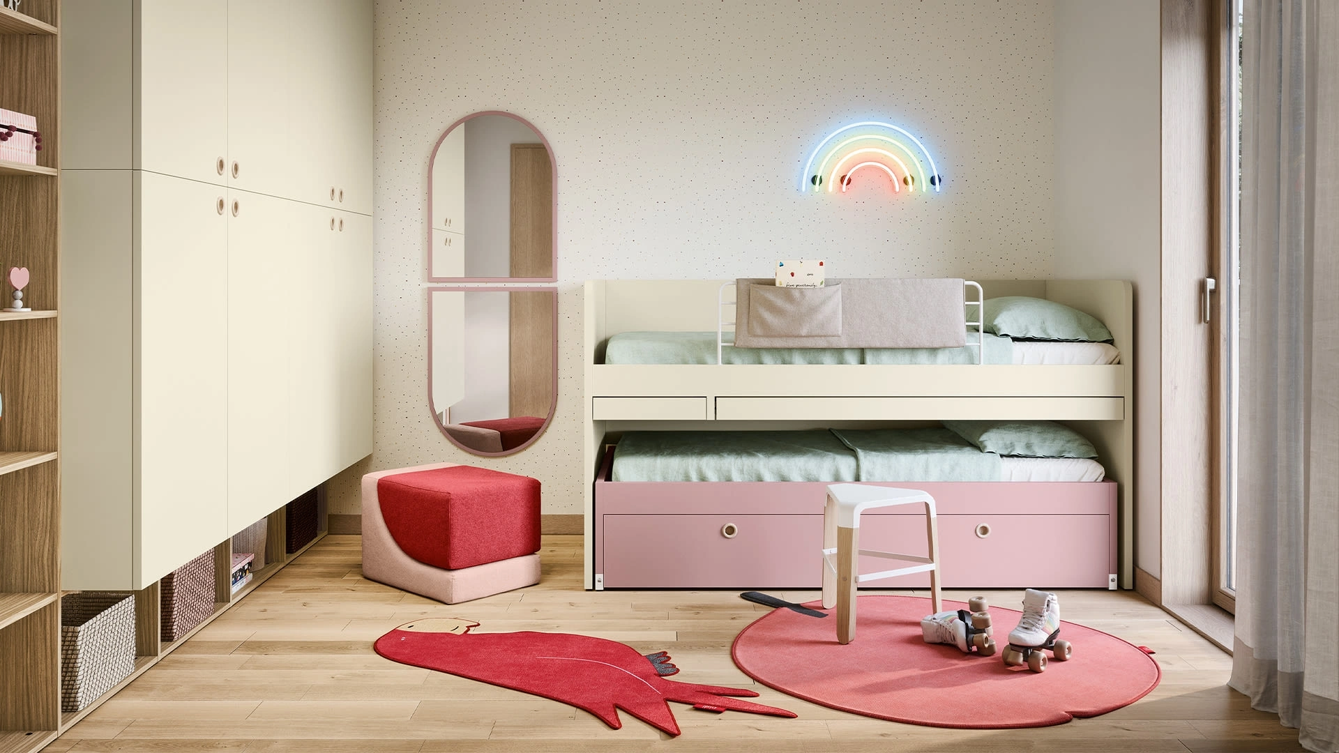 Le Camerette dei nostri bambini sono lo spazio dove passeranno i loro primi anni giocando e sognando, quindi è essenziale che lo spazio sia ben organizzato. I nostri bambini passano gran parte del giorno nelle loro camere da letto: rendile adatte per studiare, giocare e riposare tutti i giorni. Con la Cameretta Salvaspazio con Letti Rialzati di Nidi in melaminico ti assicurerai un perfetto mix di ergonomia e sicurezza, ideale per la stanza dei tuoi bambini. Presentiamo in negozio svariate Camerette salvaspazio moderne per bambine del brand, ideali per seguirli durante la loro crescita.