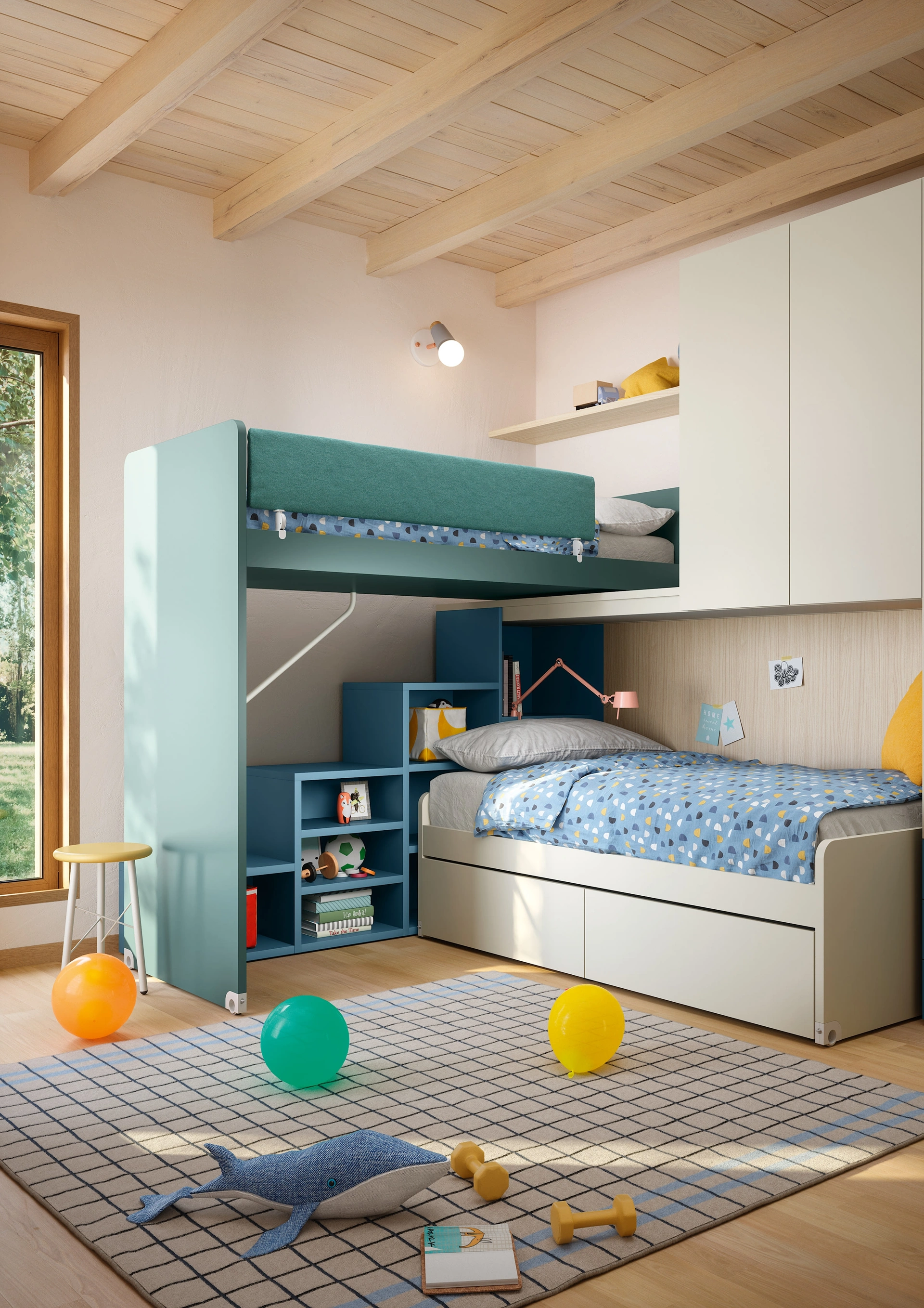 Se cerchi idee creative per progettare perfettamente la stanza dei tuoi figli, ti proponiamo la Cameretta Soppalco Scorrevole Slide di Nidi con finitura in melaminico.