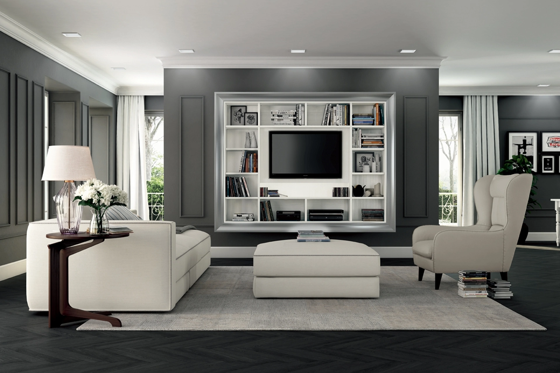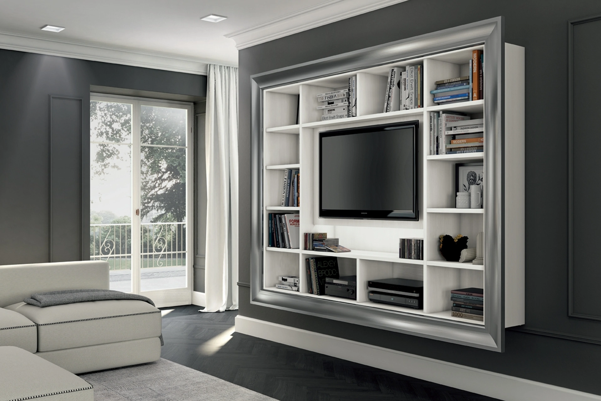 Finiture di pregio e forme decise: scopri la libreria Arcadia AS007 di Colombini Casa tra le più originali Librerie classiche sospese.