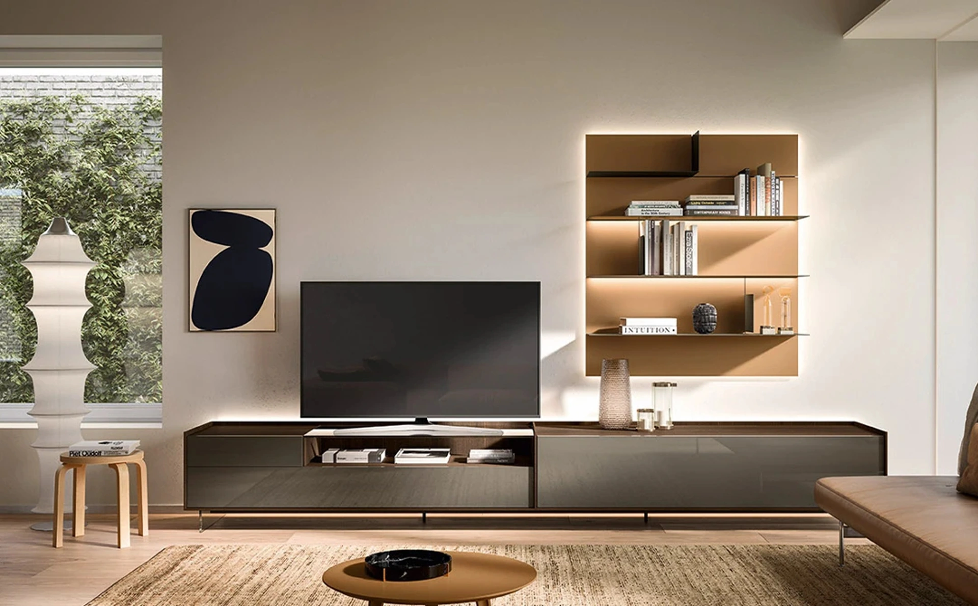 Vuoi ammobiliare un living operativo e pratico? Ecco a te la parete attrezzata Cabaret Glass 04 Sangiacomo dalle forme decise moderne.